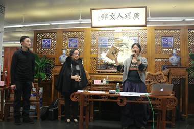图4.梁之洁女士向读者介绍赠书《素心琴韵曲艺情》收录文献的情况。左起:周仕深、梁素琴、梁之洁。