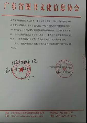 为深入贯彻党的十九大精神,认真践行习近平新时代中国特色社会主义思想,求真务实,与时俱进,充分发挥科学研究课题载体的示范、引领和推动作用,指导广大会员开展图书文化信息研究,为全民阅读、健康中国和政府决策提供有价值的研究成果,充分发挥了协会在图书、文化、信息领域的导向与引领作用,推动协会的可持续发展,广东省图书文化信息协会继2014、2016和2017年成功组织实施社会科学研究立项课题之后,2018年申请继续与广东省社会组织管理局联合开展科学研究课题申报与立项评审。2018年度社会科学研究工作仍事先组织专家制定《广东省图书文化信息协会2018年度社会科学研究课题指南》供相关人员参考,研究人员可参考《课题指南》中的题目,也可自选拟题目申报,汇总后组织专家评审立项。2018年度社会科学研究立项课题成果将最终结集,由出版社正式出版。本年度将设置重点项目和一般项目,重点项目立项资助3000元每项,一般项目可由企业资助或申报人单位自筹资金开展研究。